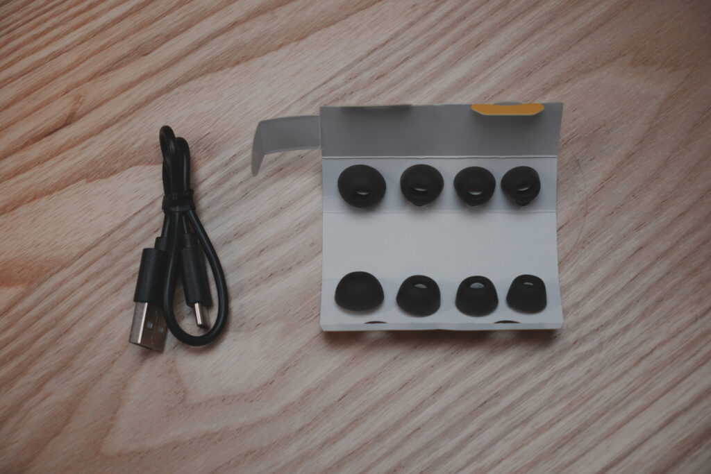 本体、説明書以外に充電用のUSB-A to USB-Cケーブルが1本、交換用イヤーチップが入っています。
