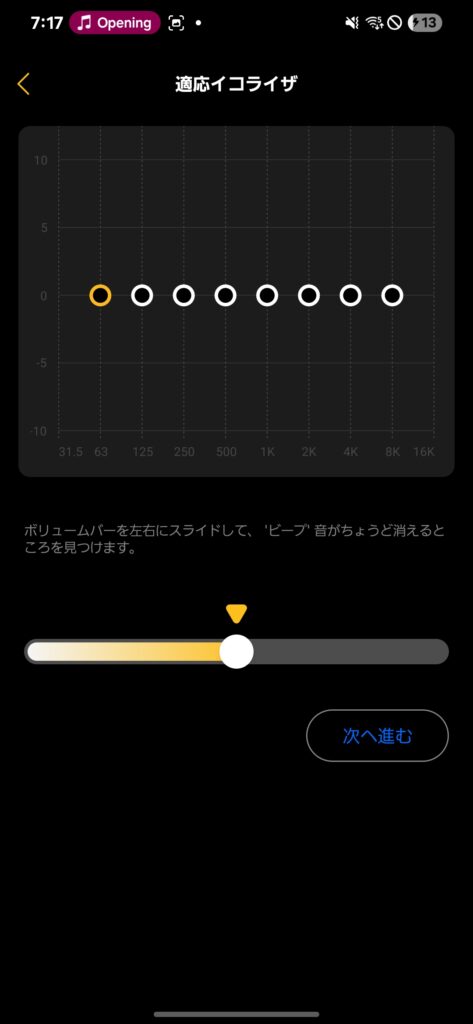 上のキャプチャの一番下にある”適応イコライザ”が自分の耳に合わせて調整できるものになっていて、これを開くと下のキャプチャのような画面に遷移します。
