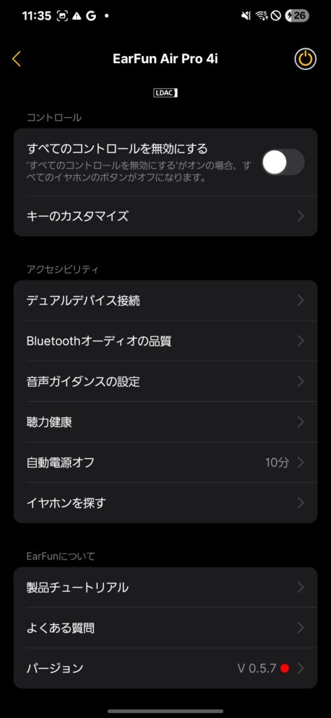 LDACをオンにする設定や操作方法のカスタマイズ、イコライザ調節、ノイキャン強度調節等は全てアプリで行います。