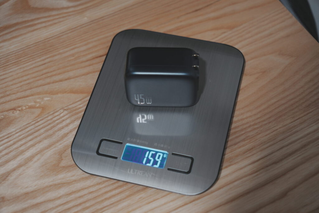 先ほど比較した別メーカーの45W充電器の重さが約159gなので相当軽いのがわかると思います。
